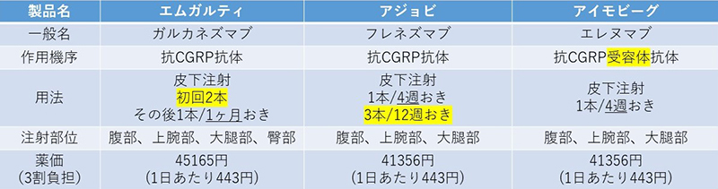 これまで片頭痛予防の注射薬はエムガルティのみでしたが、この8月から新たに2種類の片頭痛予防注射薬が使用可能になりました。