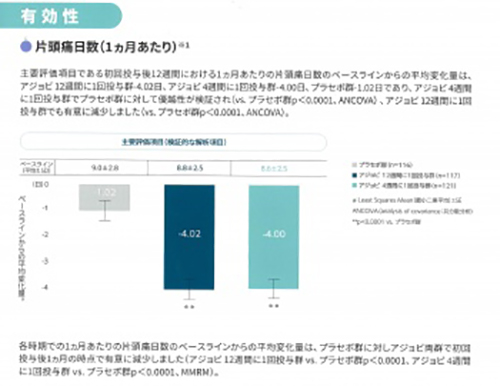 ・片頭痛予防薬内服の有無にかかわらず、片頭痛の日数が減少します。