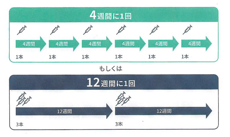 ①4週間おきに1回1本あるいは12週間おきに1回3本の皮下注射を行います。
