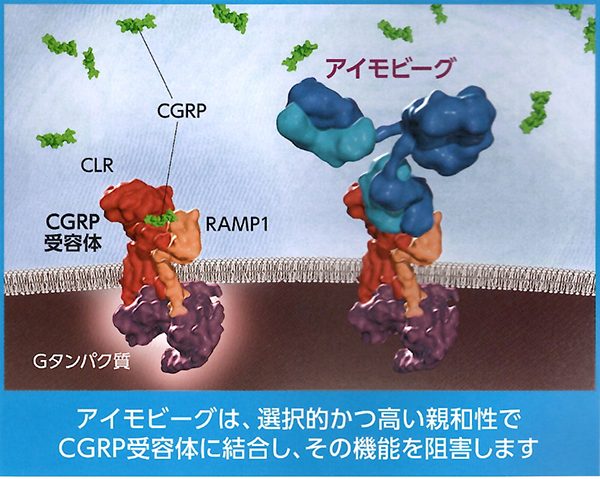 片頭痛の原因とされるCGRP(カルシトニン関連ペプチド)は、頭痛発作時に多く出現する物質です。アイモビーグはCGRPを必要な分だけ取り込む受け皿(受容体)に蓋をすることで、片頭痛発作を抑えることができます。
