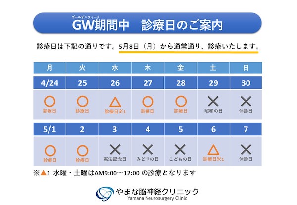 2023年4月29日~5月7日までのゴールデンウィーク期間の診療日は以下の通りになります。