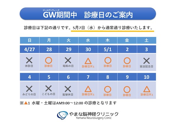 2025年4月27日~5月6日のゴールデンウィーク期間は暦通りに診療します。